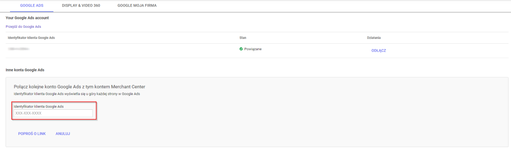 Po kliknięciu wyświetli się okno, w które należy wpisać swój identyfikator klienta Google Ads znajdujący, który znajduje się na koncie użytkownika Google AdWords w prawym górnym roku paska. Po wpisaniu konta należy kliknąć przycisk “POPROŚ O LINK”