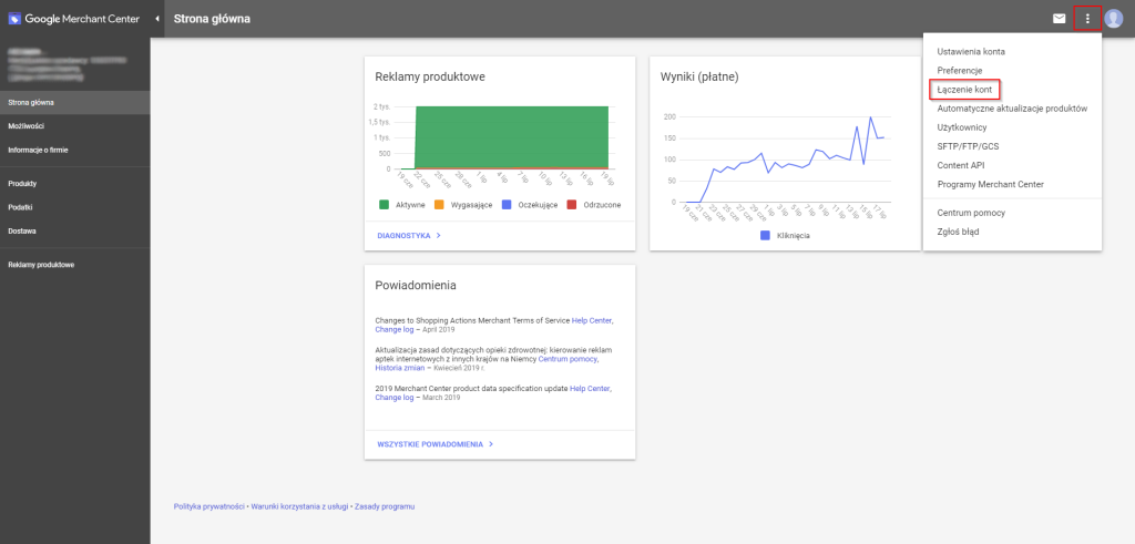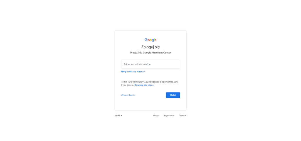 Na początek należy zalogować się na swoje konto Google Merchant Center