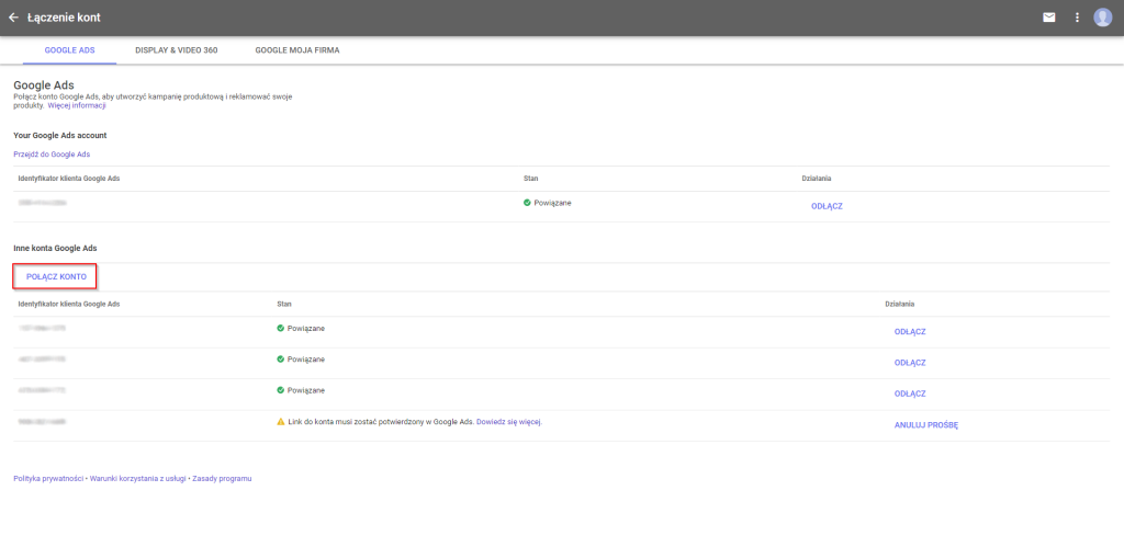 Po kliknięciu opcji łączenia kont otworzy się okno z możliwością łączenia konta AdWords, należy nacisnąć przycisk “POŁĄCZ KONTO”
