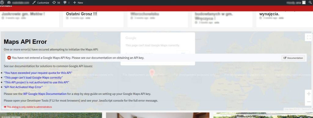 Problem Google Maps pojawia się ostatnio dość często i wynika to z faktu, że Google wprowadziło pewne zmiany w zakresie użytkowania Api Google Maps. Zmiany związane są z dziennym limitem darmowych wyświetleń mapy. Limit ten został zmniejszony więc częściej zdarza się, że zostaje on przekroczony co powoduje pojawianie się komunikatu o problemie z czytaniem Map Google. Dodatkowo użytkownik nie ma możliwości korzystania z darmowego limitu w momencie kiedy nie spiął swojego konta z Google. Wyświetlający się komunikat jest pokazany na zdjęciu poniżej.